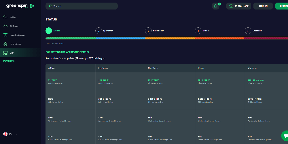 Sportler (bis zu 100 SPs), Sportler (101 bis 300 SPs), Marathonläufer (301 bis 700 SPs), Sieger (701 bis 2.000 SPs) und Champion (2.001 SPs und mehr) sind die fünf Stufen des VIP-Programms von GreenSpin Casino. Sports Points (SPs) werden durch das Spielen im Casino gesammelt und gegen einen Stufenaufstieg eingetauscht; Für jede eingezahlte 10 $ erhält ein Spieler 1 SP. Alle 90 Tage werden die Spieler analysiert, um zu sehen, ob sie genug SPs verdient haben, um eine Stufe aufzusteigen.
