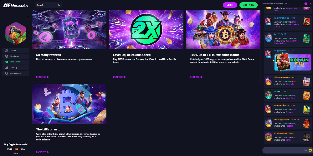 In 2022, MetaSpins, a cryptocurrency-only casino, entered the congested online gaming industry. There are more than 2000 games available, including several slot machines, card and table games, and novelty options. The operator of MetaSpins casino is hopefully working on the fact that it does not currently provide any regular promos like deposit bonuses or free spins.
