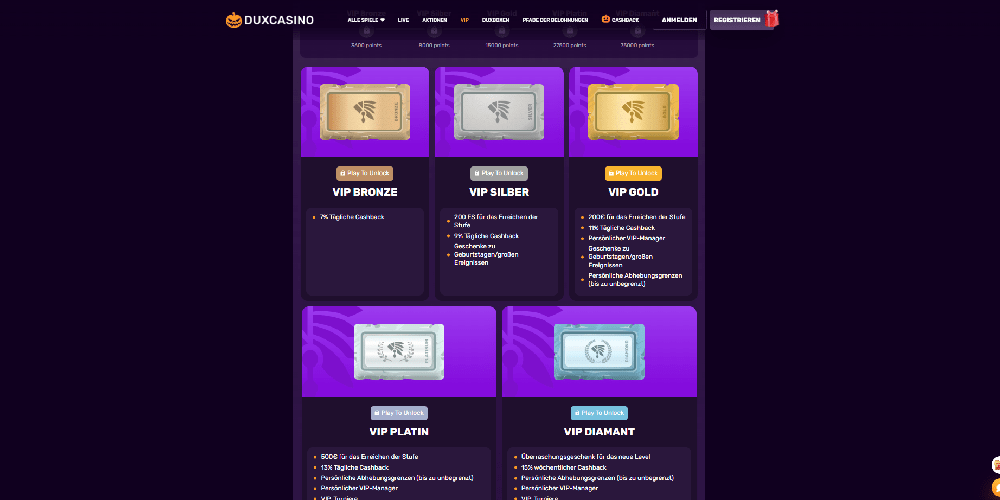 Ja, Dux Casino bietet seinen Spielern ein Treueprogramm mit einer exklusiven VIP-Lounge. Die Einstiegsstufe des Spielers in das VIP-Programm wird durch die Anzahl der gesammelten Comp-Punkte bestimmt. Bonuspunkte werden an Spieler vergeben, die mindestens 30 Euro oder US-Dollar an Spielautomaten einsetzen. Es gibt acht VIP-Stufen, für deren Zugang jeweils eine bestimmte Anzahl an Treuepunkten erforderlich ist. Wenn Spieler durch die Level aufsteigen, erhalten sie verschiedene Belohnungen, darunter Freispiele und Boni, mit einer 30-fachen Wettanforderung. Die höchste Stufe, Stufe 8, bietet erhebliche Vorteile, darunter einen Bonus von 3.000 €, 10 % wöchentliches Cashback und keine Auszahlungslimits.
