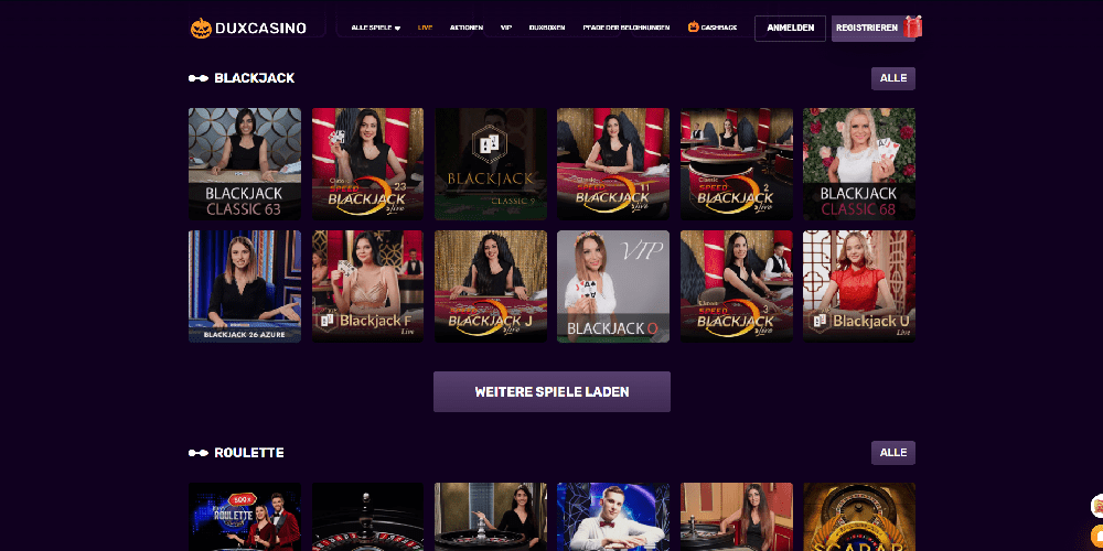 Dux Casino hat ein elegantes schwarzes Design mit violetten und goldenen Akzenten, was es zu einem starken Konkurrenten macht, wenn Ihnen das Aussehen wichtig ist. Das Layout ist typisch, mit einer Kopfleiste, die zur Registrierung anregt, einem Platz für Werbebanner und einem Vorschaubereich für Spiele. Lesen Sie weiter, um herauszufinden, wer gewonnen hat und was jetzt im Dux Casino passiert. Auf der ersten Seite gibt es prominente Links zu den zahlreichen Angeboten der Seite und eine Vorschau der akzeptierten Zahlungsmethoden. Die Website ist responsiv, sodass sich ihr Erscheinungsbild an die kleineren Bildschirme mobiler Geräte anpasst, ohne das Benutzererlebnis zu beeinträchtigen. Bei Interesse steht die Duxcasino-Mobile-App zum Download bereit.