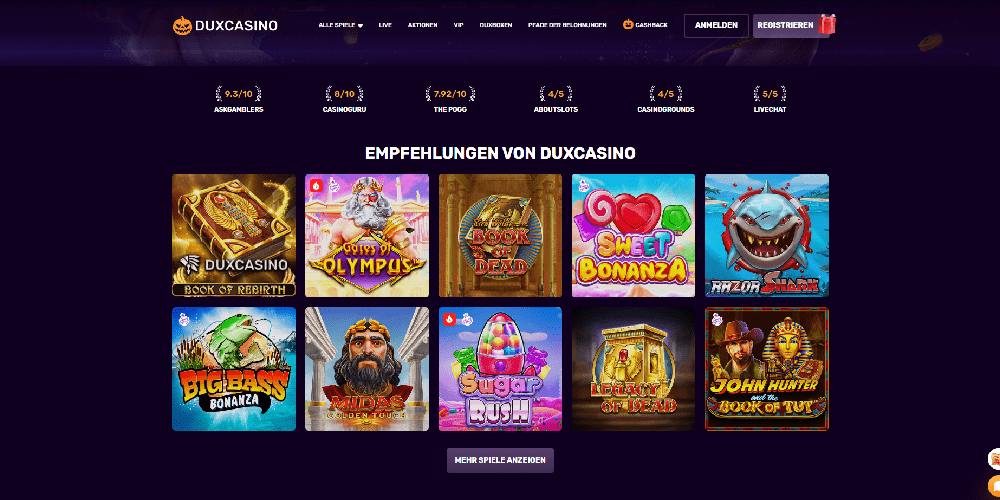 Dux Casino verfügt über mehr als 5.000 Spielautomaten von Top-Entwicklern, darunter Amatic, Bgaming, Booming, Red Tiger, Scientific, NoLimit, Playtech, Microgaming und Iron Dog, was es zu einem Top-Gaming-Ziel macht. Es stehen Spielautomaten, Tischspiele und ein von Evolution Gaming und Authentic betriebenes Live-Casino zur Verfügung. Die von Hacksaw angebotenen Schnellgewinnspiele ähneln Rubbellosen. Insgesamt können Sie ein zufriedenstellendes Spielerlebnis erwarten. Leider haben Spieler aus den USA und zahlreichen anderen Ländern aufgrund der örtlichen Glücksspielregeln keinen Zugriff auf unsere Website.