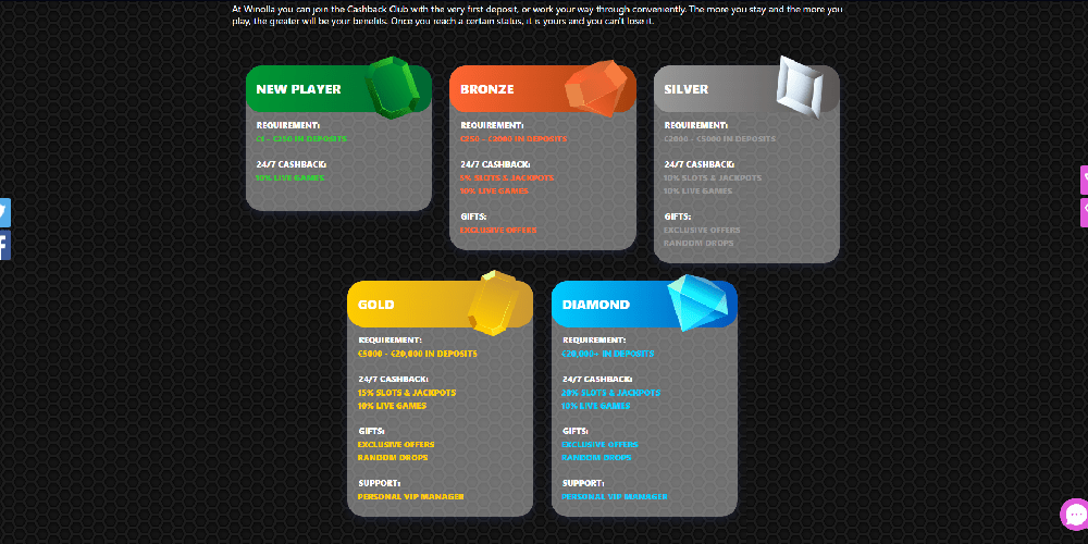 Im weiteren Verlauf haben die Mitglieder die Chance, in den exklusiven VIP-Club aufgenommen zu werden, wo sie wie Rockstars behandelt werden. Das VIP-Programm von Winolla Casino umfasst vier Stufen, für deren Teilnahme jeweils eine höhere Anzahl an VIP-Punkten erforderlich ist. Sie können eine Bronzemedaille für insgesamt 1 bis 499 Punkte, eine Silbermedaille für 500 bis 2.999, eine Goldmedaille für 3.000 bis 19.999 und einen Diamanten für 20.000 erhalten.